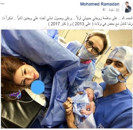 وظهر فى الصورة محمد رمضان وزوجته والطبيبة والطفلة كنز.. وعلق: "الحمد لله .. على سلامة زوجتي حبيبتي أولًا .. وعلى وصول ابنتي أخت علي وحنين.. ثانيًا شكرًا د/رشا كامل مع بعض في ولادة ( علي 2013 ) و( كنز 2017 ).
