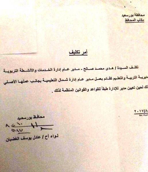أصدر اللواء عادل الغضبان محافظ بورسعيد قرارا بتكليف هدي محمد صالح مدير إدارة الخدمات والأنشطة التربوية بمديرية التربية والتعليم ببورسعيد، بالعمل كقائم بأعمال مدير عام إدارة شمال التعليمية، وذلك خلفا لـ" حنان ناصف" مديرة إدارة شمال التعليمية السابقة والتي أصدر المحافظ قرار بإيقافها عن العمل لتقاعسها عن أداء عملها.