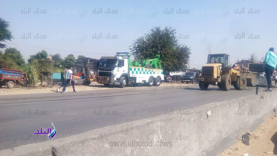 بالصور.. الونش العملاق ينجح فى رفع أنقاض حادث النقل وفتح الطريق الزراعى أمام حركة السيارات