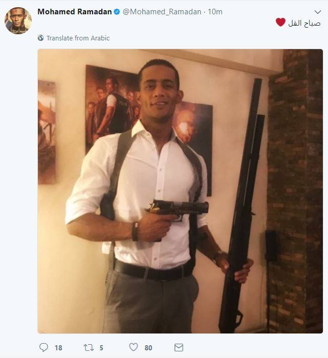 شارك الفنان محمد رمضان متابعيه عبر حسابه في موقع التواصل الاجتماعي تويتر صورة جديدة له بدا فيها حاملا مسدسا وبندقية.