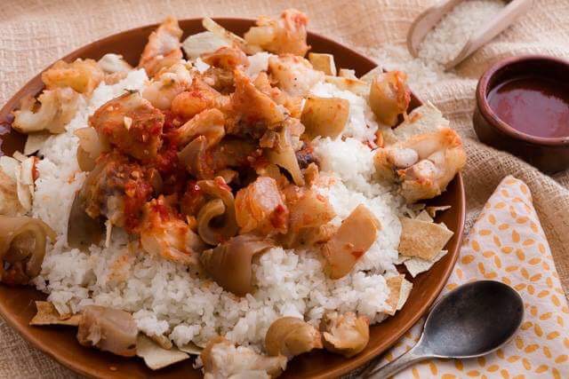 يوضع الأرز والقليل من الصلصة وترص الكوارع فوق الطبق