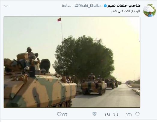 قال القائد العام السابق لشرطة دبي، الفريق ضاحي خلفان، اليوم الجمعة، عبر حسابه بموقع تويتر، إن "القوات التركية تتمركز في العاصمة الدوحة وتعلن عن حظر تجول في بعض المناطق السكنية عصرًا "، ونشر صورتين قال إنهما "للقوات التركية".