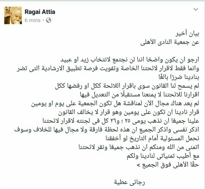 وقال "عطية"، في بيان رسمي عبر صفحته الرسمية بموقع التواصل الاجتماعي "فيس بوك"، "أرجو أن يكون واضحًا أننا لن نجتمع لانتخاب أحد، وإنما فقط لإقرار لائحتنا الخاصة وتفويت فرصة تطبيق الإرشاديةالتى تضر بنادينا ضررًا بالغًا".
