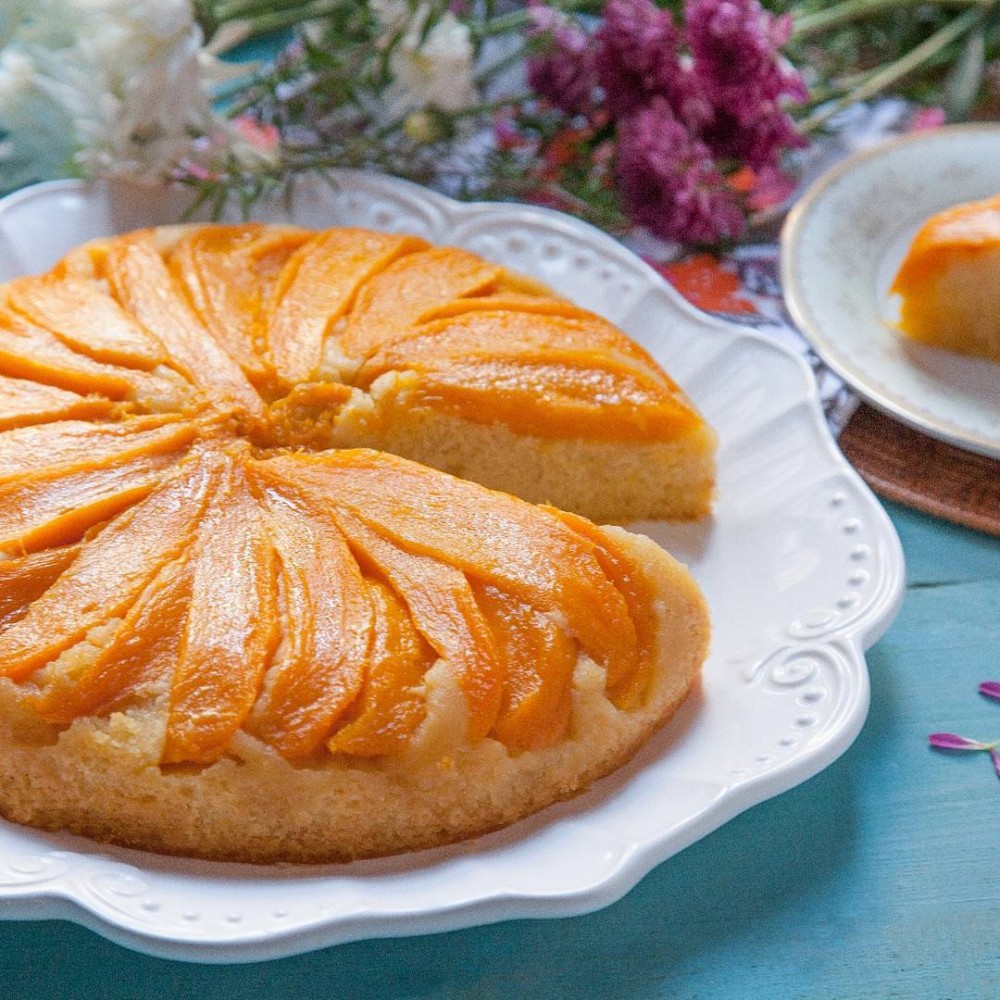 نضع الخليط ونصبه على قطع المانجو ويدخل القالب الفرن حتى تنضج وتقدم الكيكة.