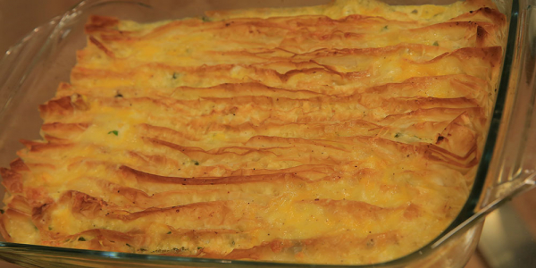 * تفرد اوراق الجلاش وتوضع الجبنة وتكشكش مثل المروحة وترص في طاجن فرن.