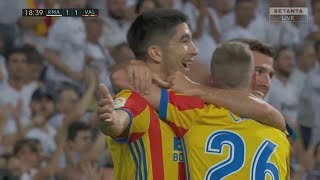 بدأ لاعبو الميرنجى بضغط هجومى مكثف على دفاعات فالنسيا وأخطأ أحد لاعبى المنافس ليتسلم أسينسو الكرة ويراوغ مدافعى فالنسيا ويسدد الكرة قوية على يسار الحارس ليعلن الهدف الأول للفريق الملكى فى الدقيقة العاشرة.
