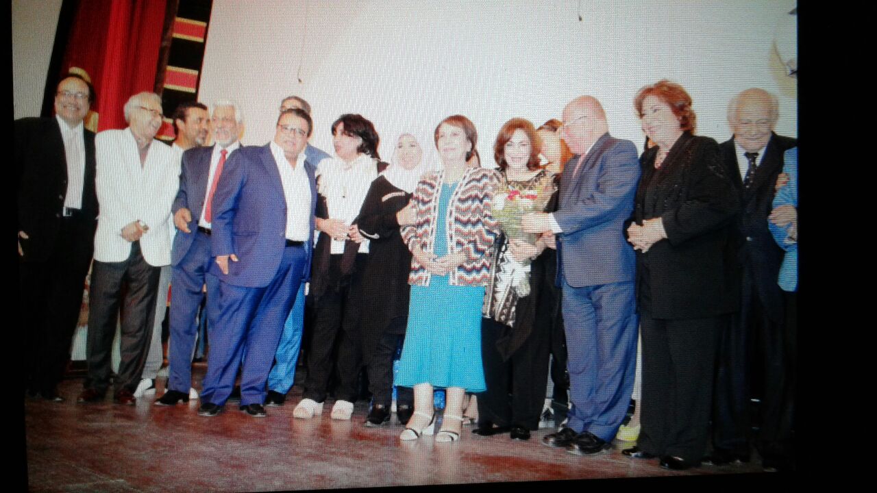 كرم، الكاتب الصحفي حلمي النمنم ويرافقه المخرج خالد جلال رئيس قطاع الانتاج الثقافي، الفنانة القديرة "نادية رشاد" وتسليمها درع قطاع شئون الانتاج الثقافى وشهادة تقدير وايضا درع المركز القومي للمسرح والموسيقى والفنون الشعبية، وشهادة تقدير تقديرا لإسهاماتها الفنية فى المسرح.