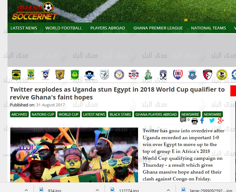 وتحدث موقع "فوتبول غانا" عن اعتلاء منتخب أوغندا لصدارة المجموعة الخامسة بالفوز الذي تحقق على مصر، موضحا أن المنتخب المصرى كان قريبًا من إدراك التعادل عبر لاعبه محمد صلاح المحترف فى نادى ليفربول الإنجليزى، عبر ضربة رأسية متقنة تصدى لها حارس منتخب أوغندا.