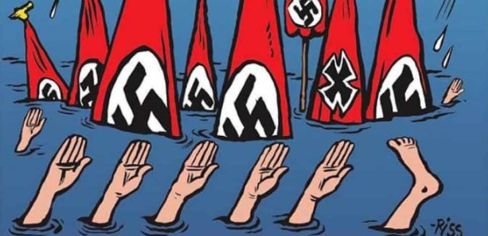 ووضعت المجلة الفرنسية الساخرة الشهرية على الغلاف صور لأشخاص يبدوا أنهم يغرقوا أسفل مياه إعصار هارفي بينما كانوا يحملون أعلام النازيين واليمين المتطرف، وكتبت فوقها:" الله موجود، أنه أغرق كل النازيين في تكساس".