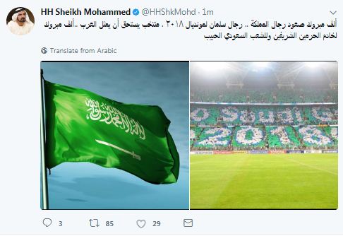 وكتب "بن راشد"، على حسابه بموقع "تويتر": "ألف مبروك صعود رجال المملكة.. رجال سلمان لمونديال ٢٠١٨.. منتخب يستحق أن يمثل العرب .. ألف مبروك لخادم الحرمين الشريفين وللشعب السعودي الحبيب".