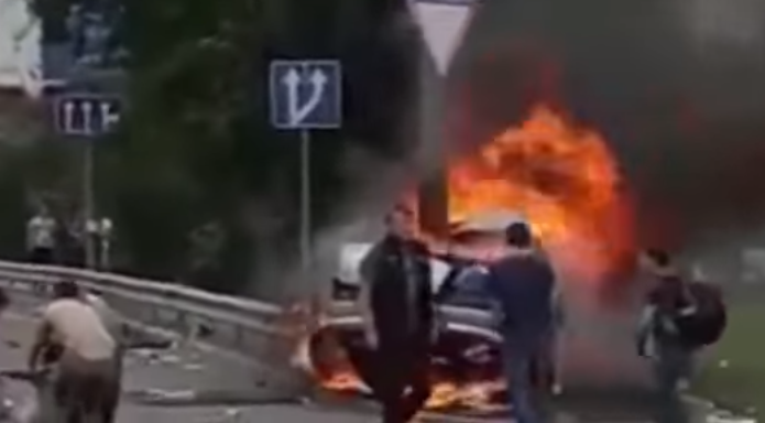 حيث اصطدم الرجل بسيارة أخري واستقر بسيارته فى عمود إنارة فى حادث ضخم على أحد الطرق السريعة فى أوكرانيا، ليدفع بنفسه من النافذة الخلفية لسيارته ماركة "أوبل" بعدما أصيب ببعض الحروق فى وجهه.