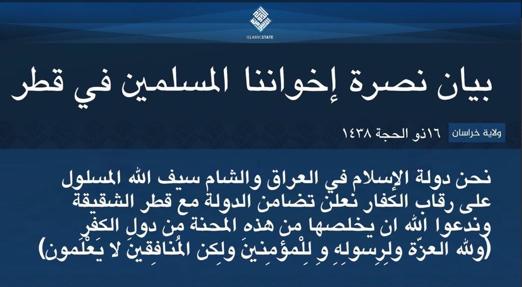 « ولاية خراسان 16 ذو الحجة 1438 .. نحن دولة الإسلام فى العراق والشام سيف الله المسلول على رقاب الكفار ، نعلن تضامن الدولة مع قطر الشقيقة وندعو الله أن يخلصها من هذه المحنة من دول الكفر».