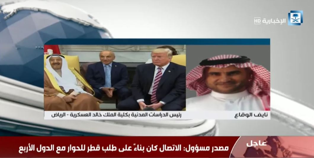 صرح نايف الوقاع رئيس الدراسات المدنية بكلية الملك خالد العسكرية السعودية في مداخلة على قناة "الإخبارية" السعودية أن نظام قطر استمرأ الكذب والدجل والمراوغة على العالم، ومن سوء حظه أن كذب على السعودية.
