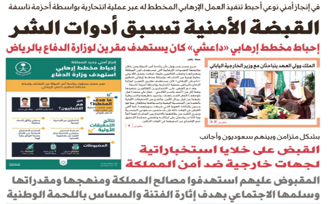 في مستهل الجولة، نطالع على صحيفة "الجزيرة" عنوان "القبضة الأمنية تسبق أدوات الشر"، وتحته أشادت الصحيفة بجهود الأمن السعودي في كشف وإحباط مخطط إرهابي لتنظيم «داعش الإرهابي» كان يستهدف مقرين تابعين لوزارة الدفاع بالرياض بعملية انتحارية بواسطة أحزمة ناسفة، وفقا لمصدر مسئول أضاف أن رئاسة أمن الدولة ومن خلال متابعتها التهديدات الإرهابية التي تستهدف أمن المملكة ومقدراتها وتعقب القائمين عليها، تمكنت بفضل الله في عملية نوعية من القبض على الانتحاريين المُكلفين بتنفيذها، وهما كل من أحمد ياسر الكلدي وعمار علي محمد قبل بلوغهما المقر المستهدف، وتحييد خطرهما والسيطرة عليهما من قبل رجال الأمن.