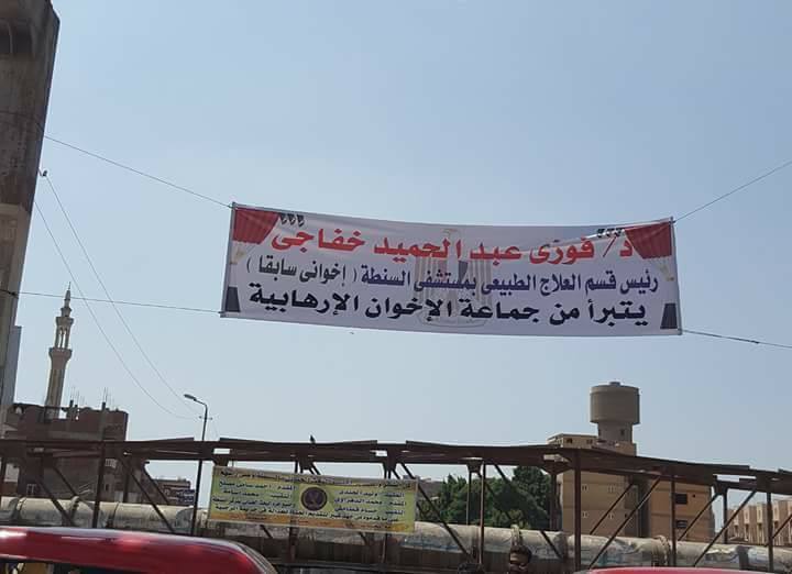 علق الدكتور فوزي خفاجي رئيس قسم العلاج الطبيعي بمستشفى السنطه لافتة بشوارع مدينة السنطة بمحافظة الغربية يعلن فيها تبرؤه من جماعة الإخوان المسلمين مكتوبا فيها "الدكتور فوزي عبد الحميد خفاجي رئيس قسم العلاج الطبيعي بمستشفى السنطة "اخواني سابق" يتبرأ من جماعة الاخوان الارهابية .