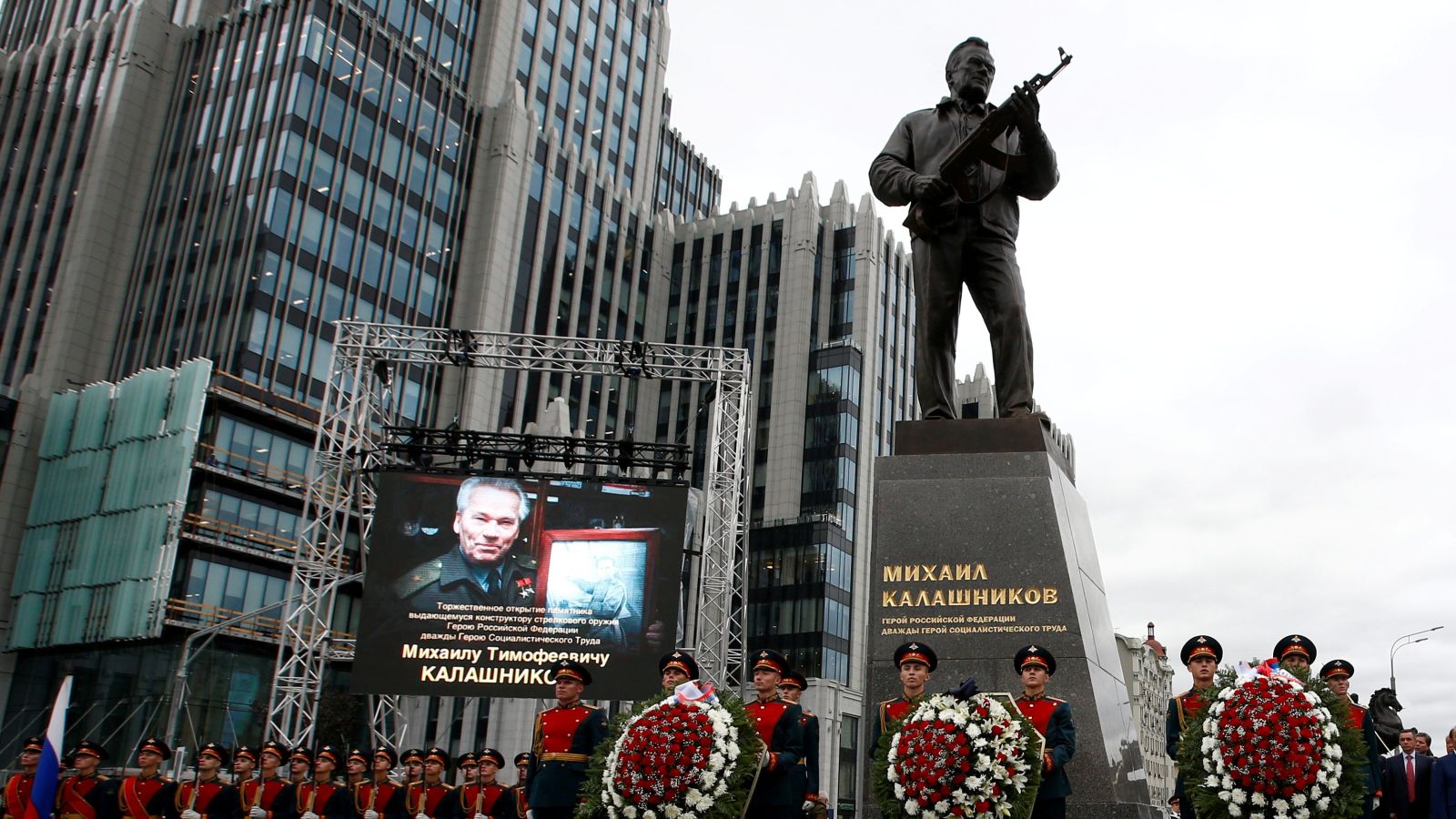 وقالت صحيفة "الجادريان" البريطانية، أنه لأجل تخليد ذكرى صانع البندقية "ميخائيل كلاشنيكوف"، قامت روسيا بتدشين تمثال لمخترع البندقية.