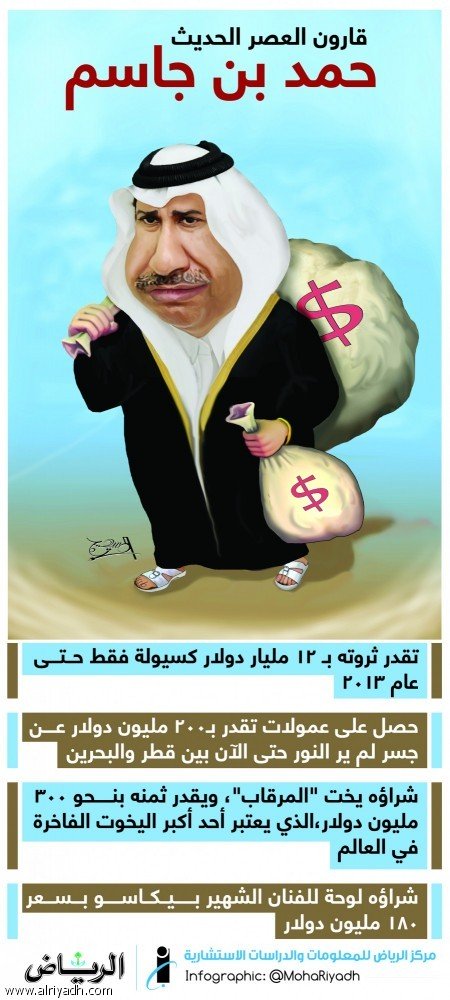 قالت صحيفة الرياض، الجمعة، إن مصادر في المعارضة القطرية كشفت عن التضخم الكبير لثروة حمد بن جاسم رئيس الوزراء ووزير الخارجية القطري السابق والذي يثير علامات التعجب والاستفهام حول مصدرها، مشيرة إلى أنه جمعها من الصفقات المشبوهة والعمولات الضخمة التي حصل عليها من ثروات الشعب القطري، وقالت المعارضة القطرية عن حجم ثروة حمد بن جاسم بلغت 12 مليار دولار كسيولة فقط حتى عام 2013، علاوة على امتلاكه شركة الخطوط الجوية القطرية وبنك قطر الدولي بالإضافة إلى فندقي الفورسيزونز وويست باي.