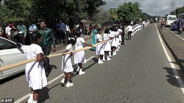 وحمل نحو 250 طالبا ذيل فستان الزفاف طوله ميلين كانت ترتديه العروس، وهي تسير على طريق رئيسي في وسط مدينة كاندي في سريلانكا.