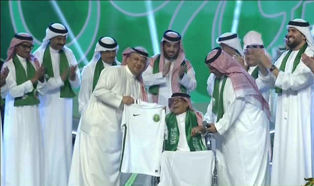 منح الدكتور عادل عزت، رئيس الاتحاد العربي السعودي لكرة القدم قميص المنتخب الوطني السعودي للفنان أبو بكر سالم، خلال احتفالية المملكة باليوم الوطني السعودي الـ 87 . وعلق سالم قائلا «المنتخب مهم واحب فريق الاتحاد».