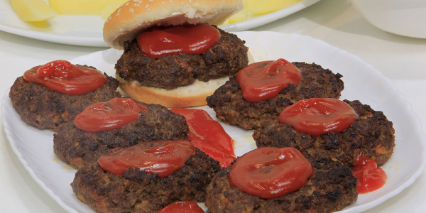 * يقدم البرجر مع الخبز الكيزر والكاتشاب.