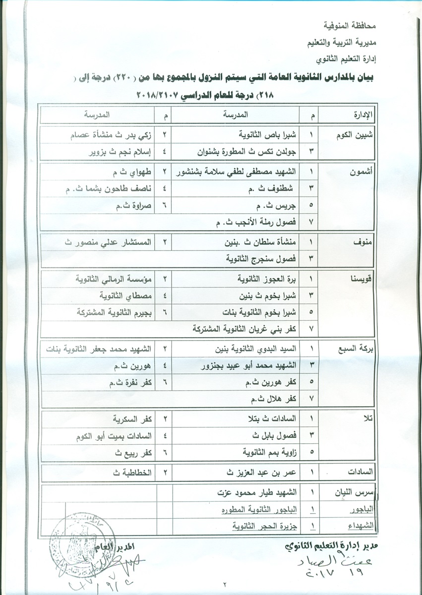 وأضاف أن المدارس فى ادارة اشمون هى مدرسة الشهيد مصطفى لطفى سلامة بشنشور ومدرسة طهواى الثانوية م ، ومدرسة شطنوف ث م، ومدرسة ناصف طاحون بشما ث م ومدرسة جريس ث م ومدرسة صراوة ث م وفصول رملة الانجب ث م ، وفى ادارة منوف مدرسة منشأة سلطان ث بنين ومدرسة المستشار عدلى منصور الثانوية وفصول سنجرج الثانوية ، وفى قويسنا مدرسة بر العجوز الثانوية ومؤسسة الرمالى الثانوية ومدرسة شبرابخوم الثانوية بنات ومدرسة مصطاى الثانوية ومدرسة شبرابخوم الثانوية بنات ومدرسة بيجيرم الثانوية المشتركة ومدرسة كفر بنى غريان الثانوية المشتركة.