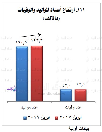 أعلن الجهاز المركزى للتعبئة العامة والإحصاء، ارتفاع أعداد المواليد والوفيات خلال شهر أبريل 2017، مقارنة بمثيله من العام الماضى، حيث بلغ عدد المواليد فى أبريل الماضى 193.3 ألف مولود مقابل 190.6 ألف خلال أبريل 2016، بارتفاع 2700 مولود خلال عام.
