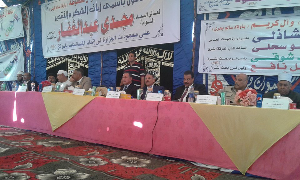 حضر مراسم الصلح اللواء عمر عبد العال، مدير أمن سوهاج، اللواء عمرو عزمى، السكرتير العام للمحافظة، واللواء جلال ابو سحلى، مساعد المدير لفرق الشرق القيادات الامنية و الشعبية والتنفيذية ورجال الدين وعدد من العمد والمشايخ وكبار العائلات بالقرية والقرى المجاورة الذين حضروا للمشاركة فى مراسم جلسة الصلح.