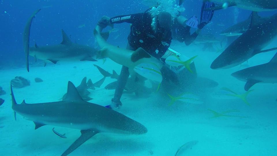 عوقب غواص من قبل رئيسه في العمل بعد أن انهال بالضرب على مجموعة من القروش خلال جولته الاسترشادية أسفل قاع البحر في جزر بالهامة.