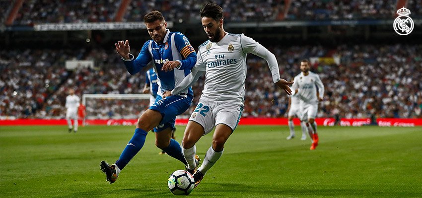 تقدم فريق ريال مدريد على منافسه فريق إسبانيول، بهدف دون رد في الشوط الأولمن المباراة التي تقام الآنعلى ملعب استاد سانتياغو برنابيو، ضمن منافسات الأسبوعالسابع من الدوري الإسباني الممتاز .