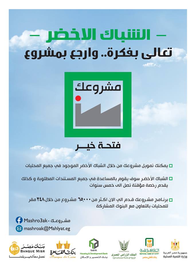 يتم التقدم للحصول على القروض من خلال مقرات مشروعك بمجالس المدن بالمراكز السبعة بالمحافظة (الشباك الواحد) ويتم تمويل المشروعات المتناهية الصغر والصغيرة والمتوسطة أو تطوير وتوسيع نشاط المشروعات القائمة.