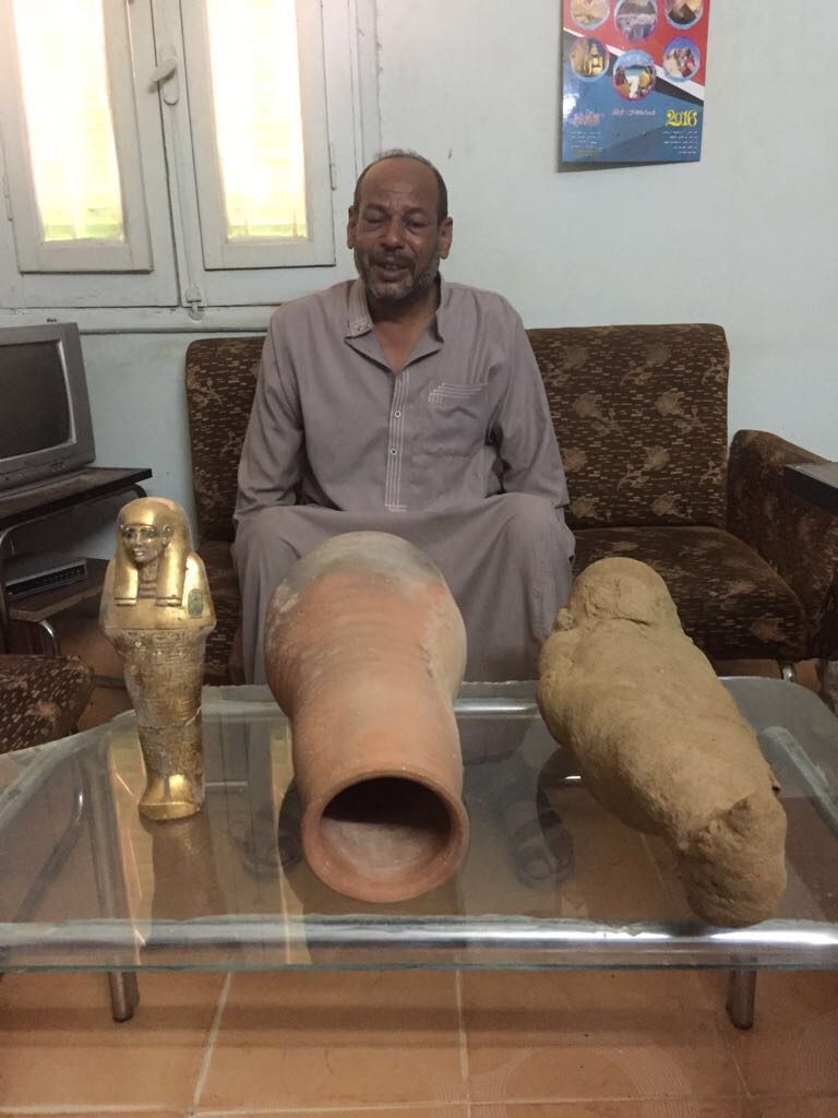 بتقنين الإجراءت وتفتيش منزله تم ضبط عدد ١٤ تمثال اوشابتي من الحجر الجيري مختلف الاحجام باطوال تتراوح ما بين ٨ سم حتى ١٨ سم وكذا عدد ٣١ عملة معدنية مختلفة الاحجام و٢ مسرجة من الفخار وتمثال من العاج مجوف من الداخل على شكل أحد ملوك الفراعنة بطول ٦ سم وجعران من الحجر الجيري مطلي باللون الاسود وتميمه من الجرانيت الاسود بطول ٤ سم وبعرض المضبوطات على مفتش المنطقة الشمالية للاثار المصرية قرر أثريتها.