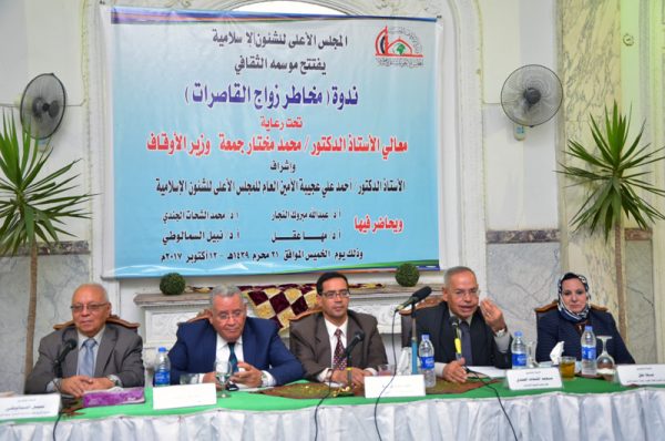عقدت اليوم الخميس أولى ندوات الموسم الثقافي للمجلس الأعلى للشئون الإسلامية تحت عنوان (مخاطر زواج القاصرات) وحاضر فيها كل من: الدكتور نبيل السمالوطي أستاذ علم الاجتماع بجامعة الأزهر ، والدكتور عبد الله النجار الأستاذ بجامعة الأزهر وعضو المجلس الأعلى للشئون الإسلامية ، والدكتور محمد الشحات الجندي الأمين العام السابق للمجلس الأعلى للشئون الإسلامية ، والدكتورة مها عقل عميد كلية طب البنات جامعة الأزهر سابقا ومدير مستشفى الدعاة ، وأدار الندوة الدكتور أحمد عجيبة أمين عام المجلس الأعلى للشئون الإسلامية ولفيف من الدعاة والإعلاميين .