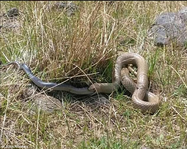 وتبين صور نشرتها صحيفة "ديلي ميل" البريطانية ثعبانا يأكل آخر خلال لحظات من اصطياده ليبتلعه بطريقة غير متوقعة.