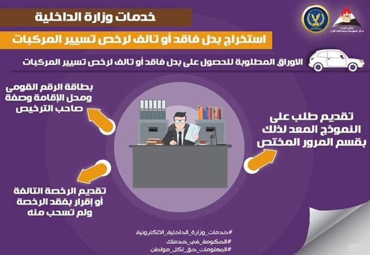 نشرت الصفحة الرسمية لمركز المعلومات ودعم اتخاذ القرار التابع لرئاسة مجلس الوزراء، "انفوجراف" يوضح خدمات وزارة الداخلية في استخراج بدل فاقد أو تالف لرخصة تسيير المركبات إلكترونيا.