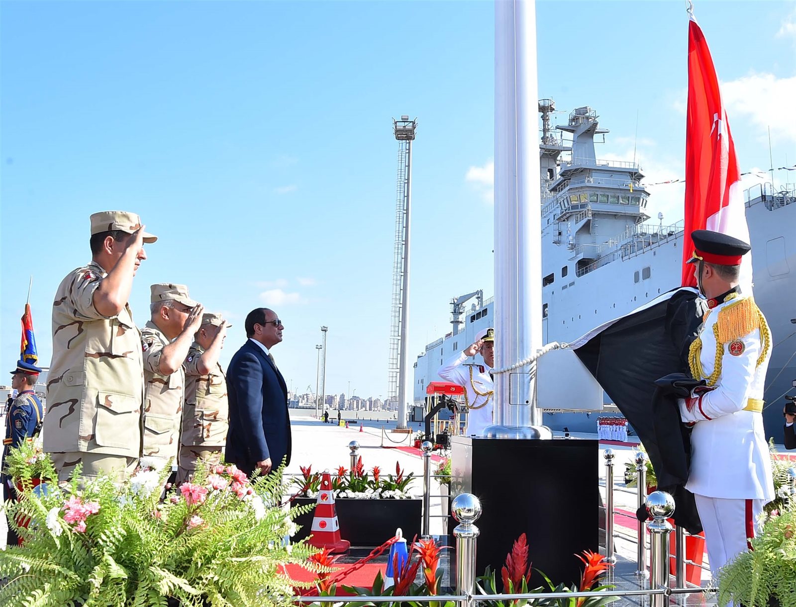 وتفقد الرئيس السيسي حاملة المروحيات انور السادات والغواصتين الجديدتين والفرقاطة الفاتح حيث تم رفع العلم علي الوحدات البحرية الجديدة لتبدأ مهامها لفرض السيادة المصرية علي مياهنا الاقليمية والاقتصادية ، واطلقت الوحدات البحرية الصفارات البحرية والمشاعل الضوئية تحية للسيد الرئيس ، وشاركت مجموعة اخري من الوحدات بالبحر برفع الاعلام البحرية واستخدام خراطيم المياه في تقليد بحري احتفالا بانضمام الوحدات الجديدة للخدمة بالقوات البحرية .