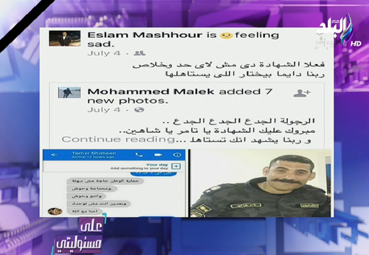 واضاف " موسي " فى برنامجه " على مسؤليتي " المذاع على قناة " صدى البلد " ، أن الشهيد إسلام مشهور كتب عبر موقعه على موقع التواصل الإجتماعى فى الرابع من شهر يوليو الماضي قائلا " فعلا الشهادة دي مش لاى حد وربنا بيختار اللى يستاهلها " .