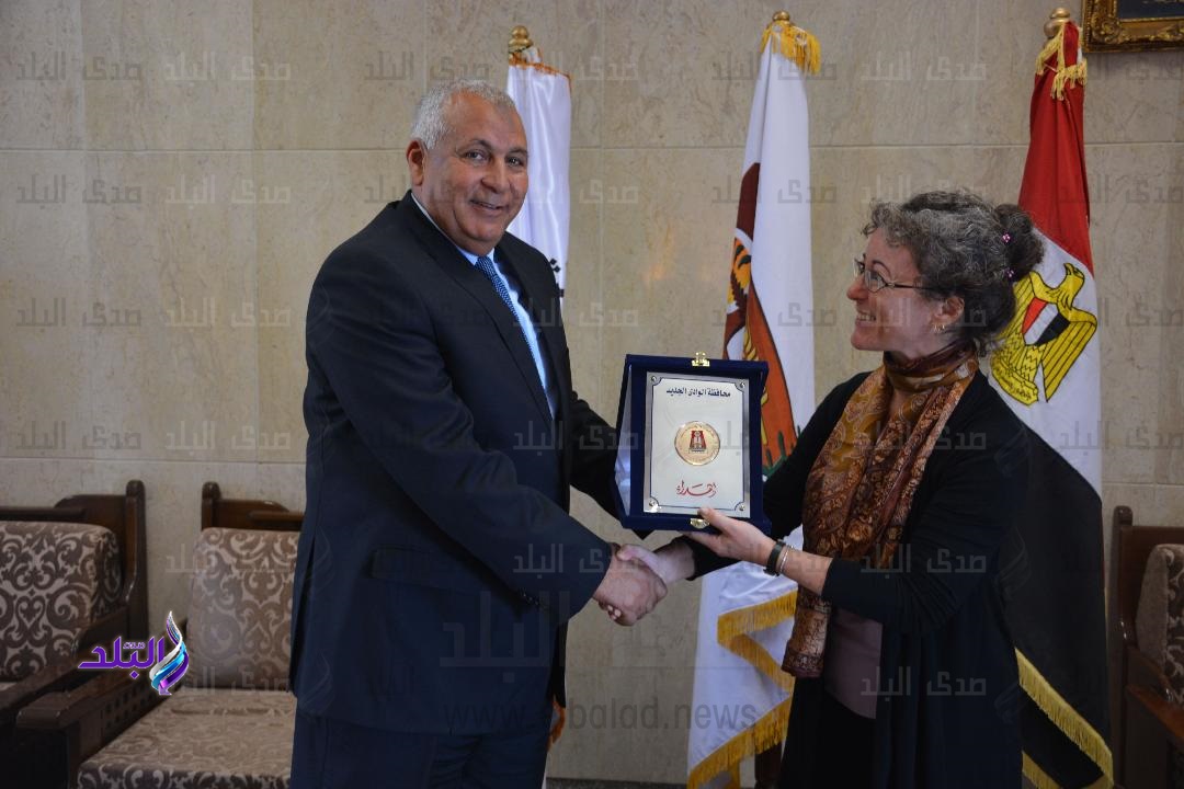 كرم اللواء محمد الزملوط محافظ الوادي الجديد، كورينا روسو رئيس البعثة الإيطالية العاملة بالتطوير والتنقيب بمنطقة أم الدبادب الأثرية.