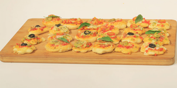 * ترص فى صينية فرن بها ورقة زبدة ثم تضاف الصلصة لقطع البيتزا وتضاف الحشوات حسب الرغبة