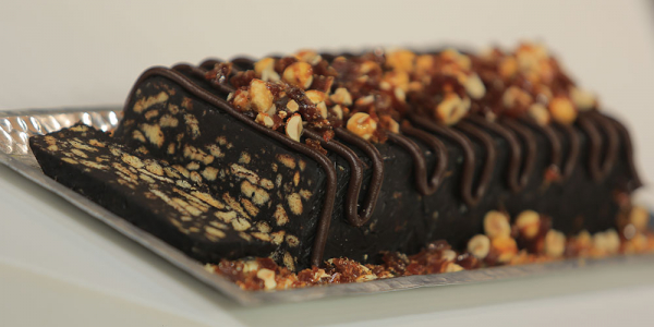 - يكسر البسكويت ثم يخلط مع خليط الكيكة بعد رفعه من على النار ويحفظ فى قالب مغلف بالنايلون وتترك في الثلاجة حتى تتماسك ثم تقطع و تزين بالبندق و صوص الشوكولاتة و تقدم ..