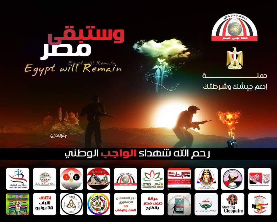 وذكر البيان أنه: "تم التنسيق والتواصل مع احمد سمير سليمان رئيس اتحاد شباب مصر بالخارج والمنسق العام لحملة ادعم جيشك وشرطتك ومن هنا نعلن تأييدنا ودعمنا والانضمام لحملة ادعم جيشك وشرطتك التي أطلقها اتحاد شباب مصر بالخارج ونكون يدا واحدة مع هذة الكوكبه الوطنية من هذة الكيانات المصرية المحترمة داعمين ومؤيدين جميعا لوطننا الحبيب تحيا مصر".