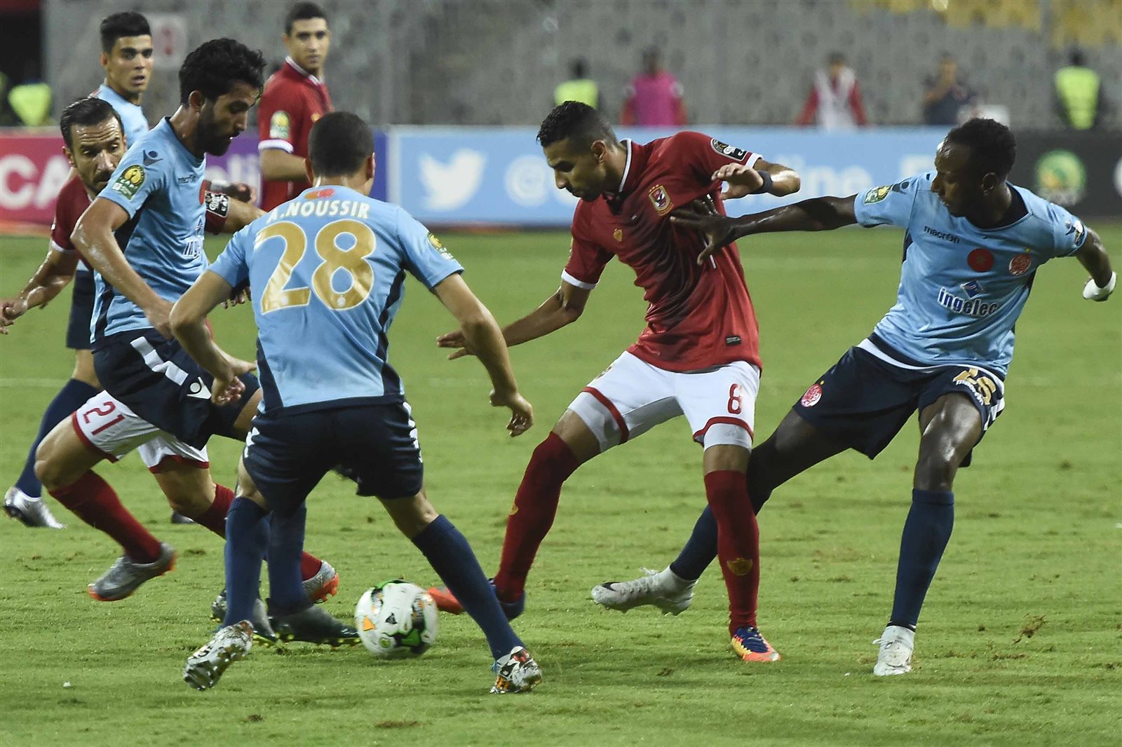 حاول لاعبو الوداد إختراق منتصف الملعب لكن اداء المارد الأحمر اتسم بالكثافة العددية والضغط على المنافس وأهدر وليد آزارو فى الدقيقة السابعة إثر إنفراده بمرمى الفريق المغربي سددها تعلو العارضة.