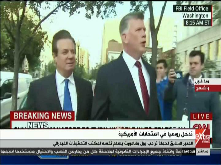 بثت فضائية "أكسترا نيوز"، اليوم الأثنين، لقطات مصورة ترصد لحظات تسليم المدير السابق لحملة ترامب بول مانافورت، لنفسه لمكتب التحقيقات الفيدرالي بواشنطن .