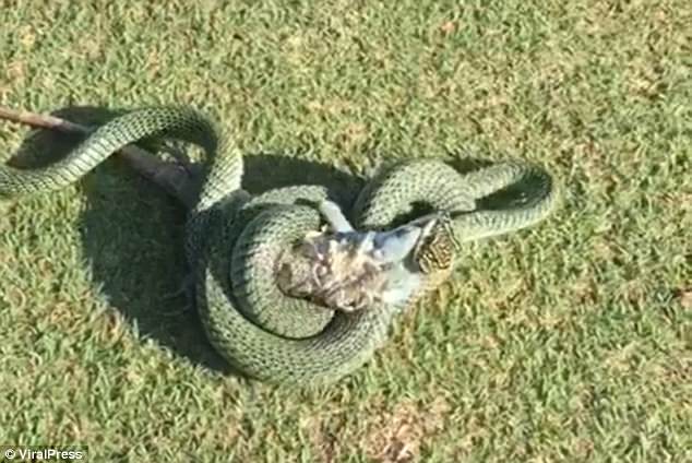 نشرت صحيفة "ديلى ميل" البريطانية مقطع فيديو صادمًا، يظهر ثعباناً ضخماً افترس سحلية عملاقة يبلغ طولها قدمين، وابتلعها فى دقائق معدودة.