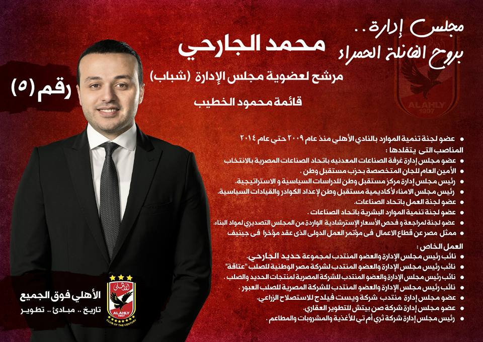 يذكر أن قائمة محمود الخطيب، المرشح على الرئاسة، تضم كلا من العامرى فاروق على منصب نائب الرئيس، وخالد الدرندلى على منصب أمين الصندوق، وفى العضوية فوق السن خالد مرتجى وإبراهيم الكفراوى ورانيا علوانى وطارق قنديل ومحمد الدماطى وجوهر نبيل، وفى العضوية تحت السن محمد الجارحى و مهند مجدي ومحمد سراج الدين.