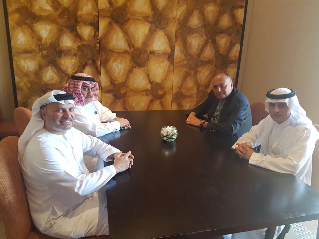 وصرح المستشار أحمد أبو زيد، المتحدث الرسمي باسم وزارة الخارجية، بأن الوزير "شكري" استهل مشاوراته السياسية بعقد لقاء رباعي مع وزراء خارجية السعودية والإمارات والبحرين تناول تطورات الأزمة القطرية.