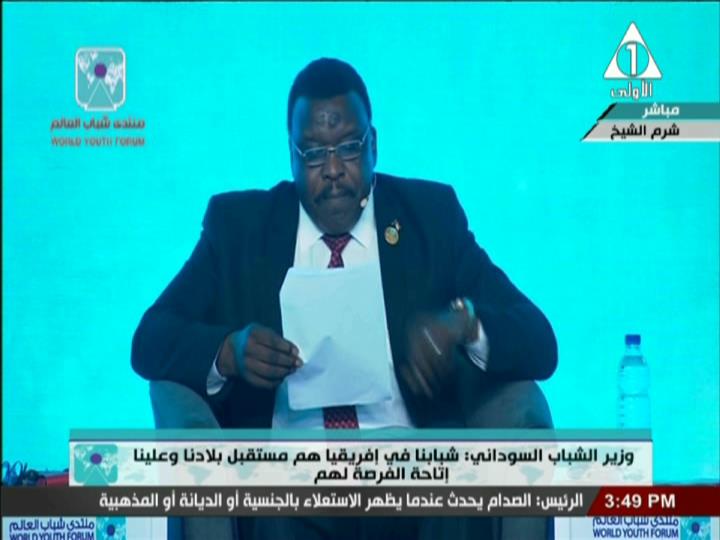 أعرب الدكتور عبدالكريم موسى وزير الشباب والرياضة بدولة السودان، عن سعادته بحضوره "منتدي شباب العالم" على أرض مصر بمدينة شرم الشيخ تحت رعاية الرئيس عبدالفتاح السيسي، قائلا:" جاء اليوم لأمثل الرئيس عمر البشير وكل شباب السودان فى واحد من المؤتمرات التى تؤكد أهمية ثقافة الحوار معربا عن شكره للرئيس السيسي لإتاحة هذه الفرصة.