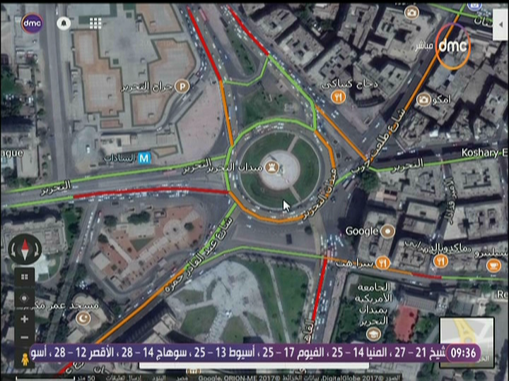 عرض برنامج "8 الصبح" المُذاع عبر فضائية "dmc" صباح اليوم، الثلاثاء، لقطات من خرائط "جوجل ماب" للحالة المرورية بالعاصمة، حيث تلاحظ وجود سيولة مرورية في ميدان التحرير.