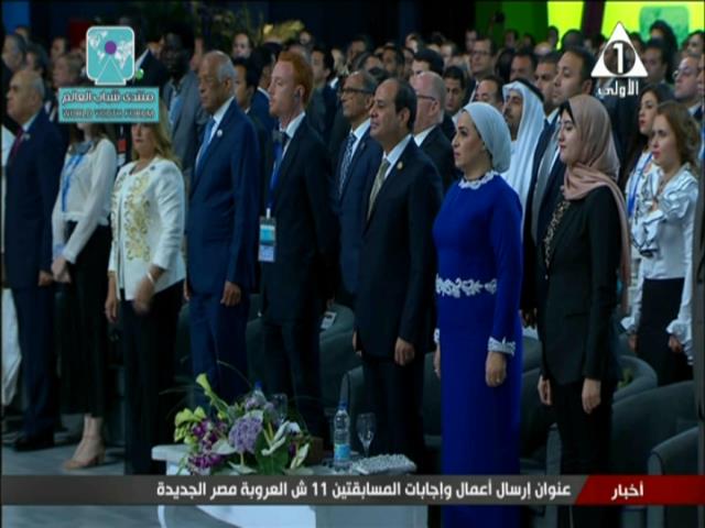 عزف السلام الوطني لجمهورية مصر العربية عقب انتهاء كلمة الرئيس عبد الفتاح السيسي بالحفل الختامي لمنتدى شباب العالم بحضور شباب العالم ورؤساء وقادة العالم.