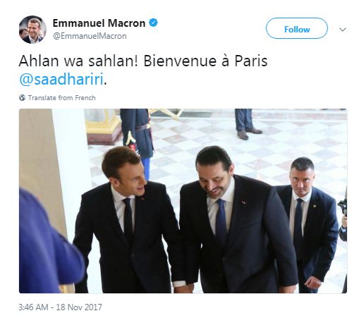 وكتب ماكرون على حسابه بموقع تويتر "أهلا وسهلا مرحبا بك في باريس يا سعد الحريري".