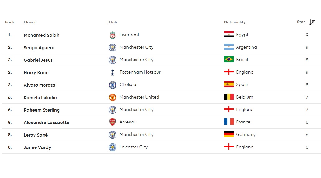 ويأتي الرباعي سيرجيو أجويرو مهاجم مان سيتي، وهاري كين مهاجم توتنهام ، وجابرييل خيسوس مهاجم مان سيتي، وألفارو موراتا مهاجم تشيلسي في المركز الثاني خلف صلاح واجويرو ولكل منهم 8 أهداف